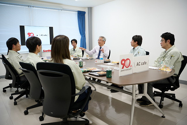当社グループでは、経営理念・パーパス・ビジョンの共有と実践を目的に、社長と社員が直接対話する「AC Cafe(エーシーカフェ)」を2023年度より展開しています。社長が本社・工場・支店・営業所・グループ会社を訪問し、社員7~8名の少人数グループとコーヒーを飲みながら語り合う場で、仕事に限らず趣味や日常の話題も交え、リラックスした雰囲気の中で意見交換が行われています。この取り組みは、風通しの良さや心理的安全性の向上にもつながっており、2025年4月時点で累計138回、983名が参加しました。2025年入社の新入社員も早期に参加し、会社の考え方を理解する貴重な機会となりました。今後も対話を重視し、より良い組織風土の醸成を目指していきます。
