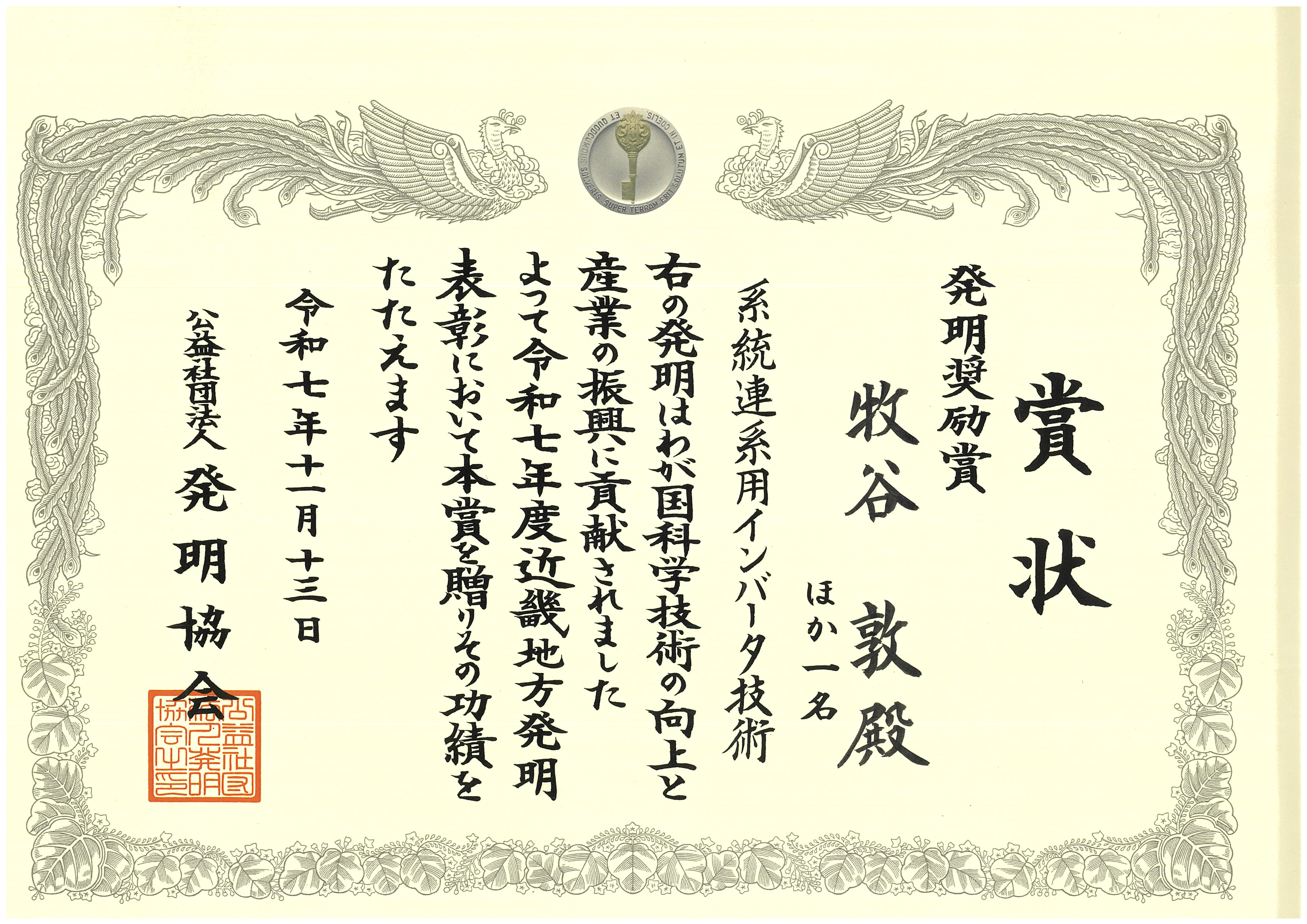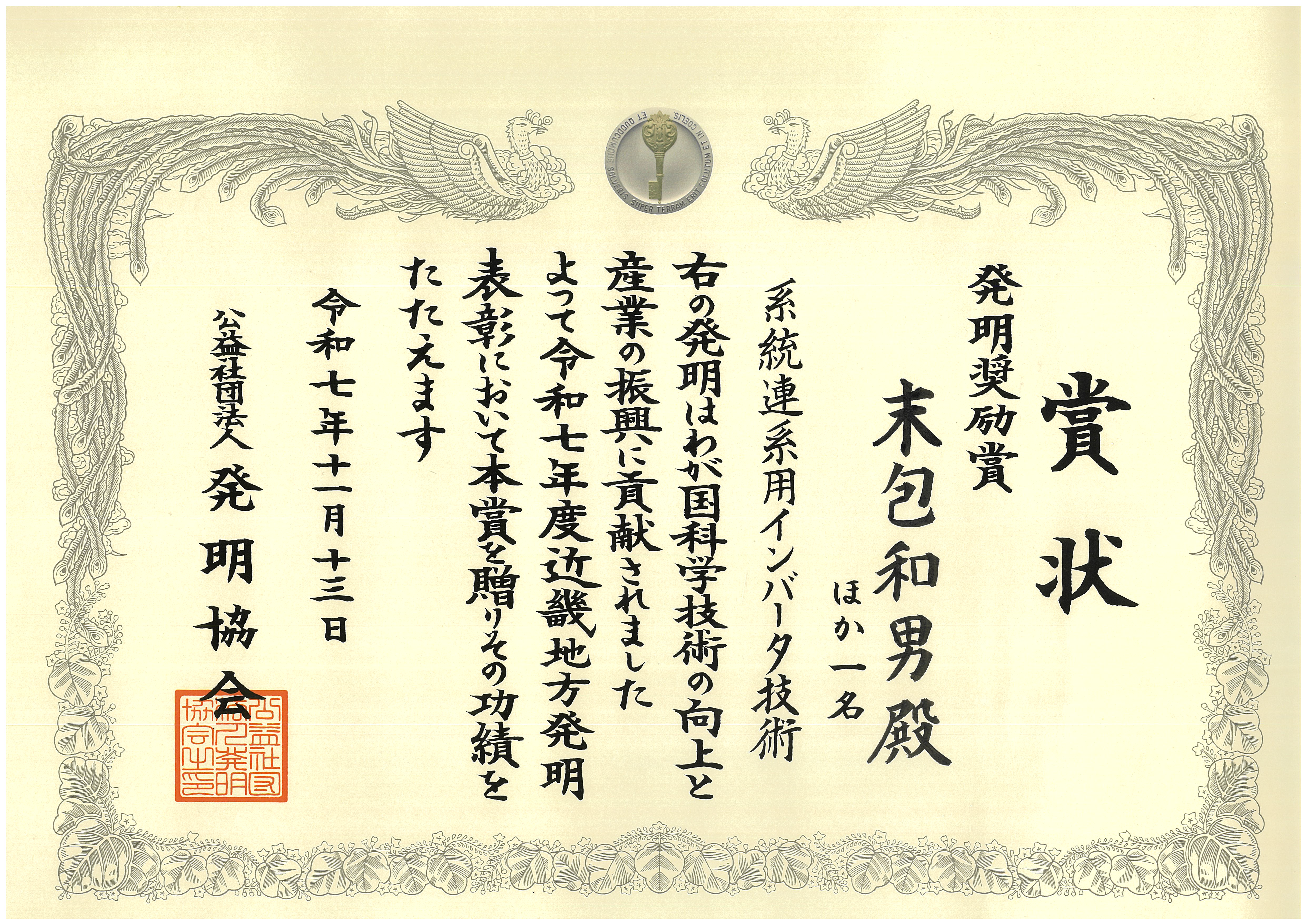 このたび、公益社団法人発明協会が主催する近畿地方発明表彰において、当社の「系統連系用インバーター技術」が実用性・社会的有用性を備えた発明として評価いただき発明奨励賞を受賞しました。
